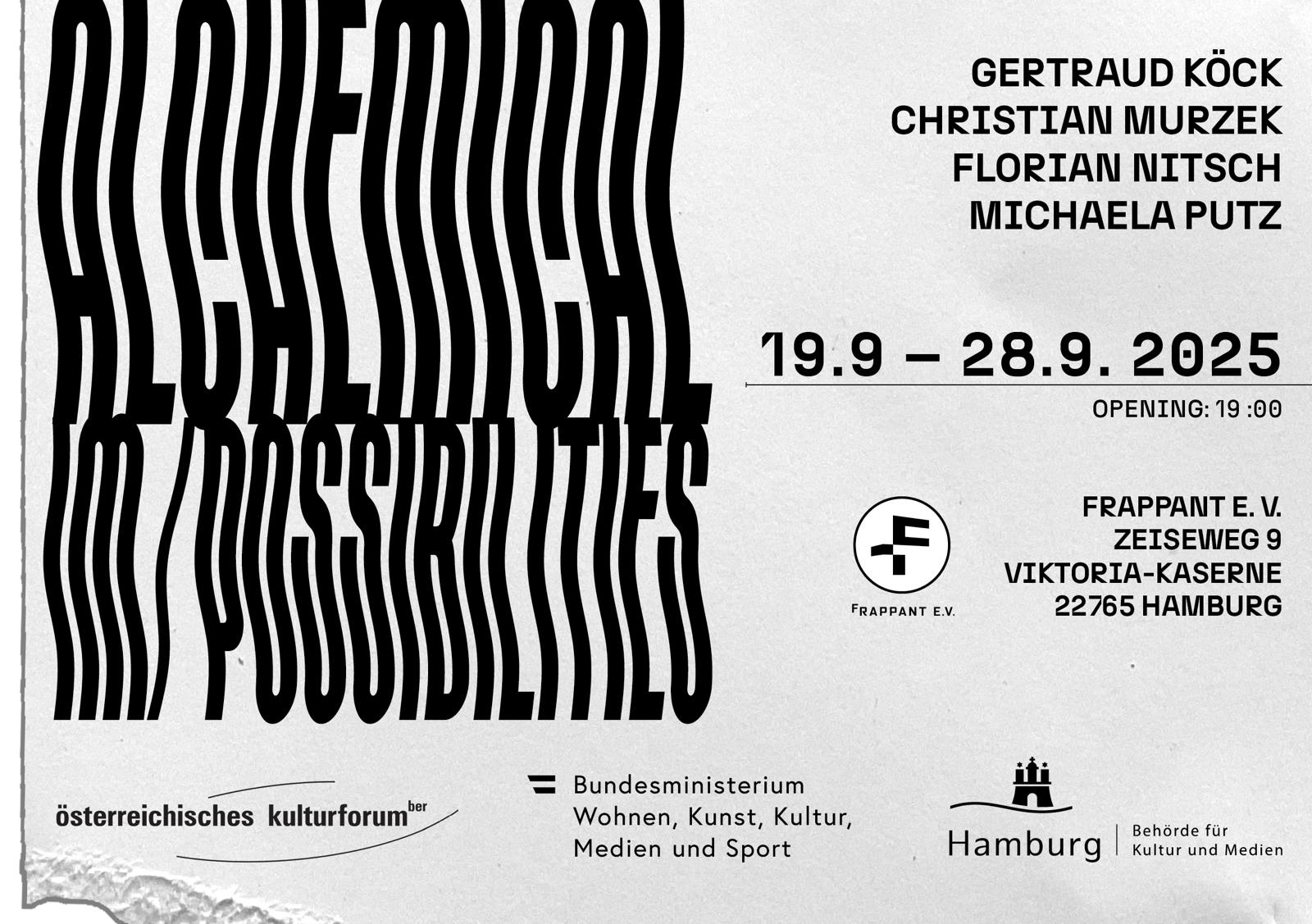 Zwischen digitalen Transkriptionen und analoger Präsenz präsentiert die Ausstellung ALCHEMICAL IM/POSSIBILITIES Werke von Gertraud Köck, Christian Murzek, Florian Nitsch und Michaela Putz, vier Künstler:innen, die sich mit den Verbindungen und Kontrasten zwischen digitaler und analoger Kunst auseinandersetzen. Sie erforscht die Auswirkungen der digitalen Welt auf Wahrnehmung, Umwelt und künstlerische Praxis der Künstler:innen. Durch verschiedene Medien wie Zeichnung, Malerei, Siebdruck, Collage, Fotografie, Objekt, Installation, Video und Performance laden die Künstler:innen dazu ein, sich mit den Themen Abstraktion, Transkription und Aufmerksamkeitsökonomie im digitalen Kontext auseinanderzusetzen.