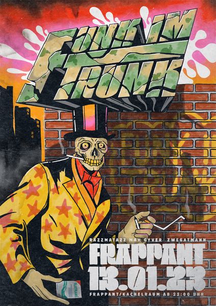 Posterboy Superspray hat letztens wieder ein paar von seinen Marlboro 200ern geraucht und war spazieren. Wie üblich hatte er ein paar Tage in einer schlecht gelüfteten Spelunke verstreichen lassen (sein Schatten spricht Bände) und es ging ihm dementsprechend gut. Euphorisiert von dem Umstand, dass sein Pegel, der ausgereicht hätte, um das Hamburger Hafenbecken über die Ufer treten zu lassen und den Fischmarkt zu fluten, auch dafür sorgte, dass der Autofokus seiner in Obstler eingelegten, blutunterlaufenen, vom Nikotin gelb angelaufenen Augäpfel die Welt nur so weichgezeichnet und verschwommen wahrnehmen lies, als hätte Gerhard Richter sie gemalt… jedenfalls war er ganz gut drauf und dachte nicht im Entferntesten daran seine Optik mit dem fauligen Zeug, das er im Toilettenkasten der Spelunke gefunden hatte, wieder scharf zu ziehen, als er die Straße überquerte…mit der Betonung auf quer. Da erwischte ihn das Scheinwerferlicht des Lebenshilfe Mobils, das ihm schon eine Weile folgte und ihm war sofort klar, dass diese grazile Momentaufnahme seiner Selbst das neue Plakatmotiv für Funk im Trunk am Freitag, 13.01.23, ab 22.00 mit Razzmatazz, Max Gyver & zwegatmann werden würde. True story. Dance along & drink a short one.