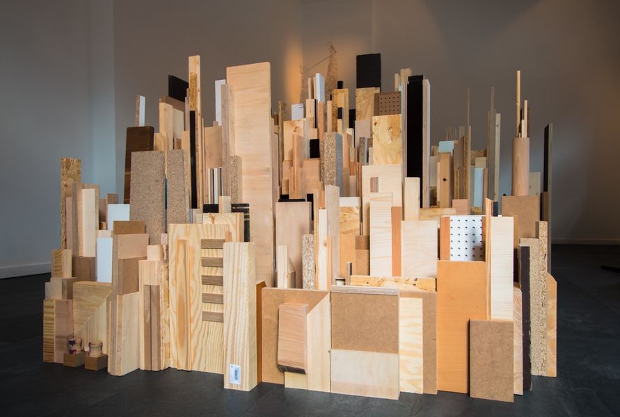 Ausgangs- und zugleich Fluchtpunkt der Ausstellung ist die mobile Installation BAU des französischen Künstlers Didier Béquillard. Die Besucher*innen sind eingeladen, in die mobile Skulptur einzugreifen, sie zu bewegen und neu zu platzieren. Der kollektive, verändernde Zugriff auf diesen Bau kulminiert zum Ende der Ausstellung in einem performativen Akt der Zerstörung, der das dystopische Finale des zu erwartenden Klimawandels symbolisch vorwegnimmt.